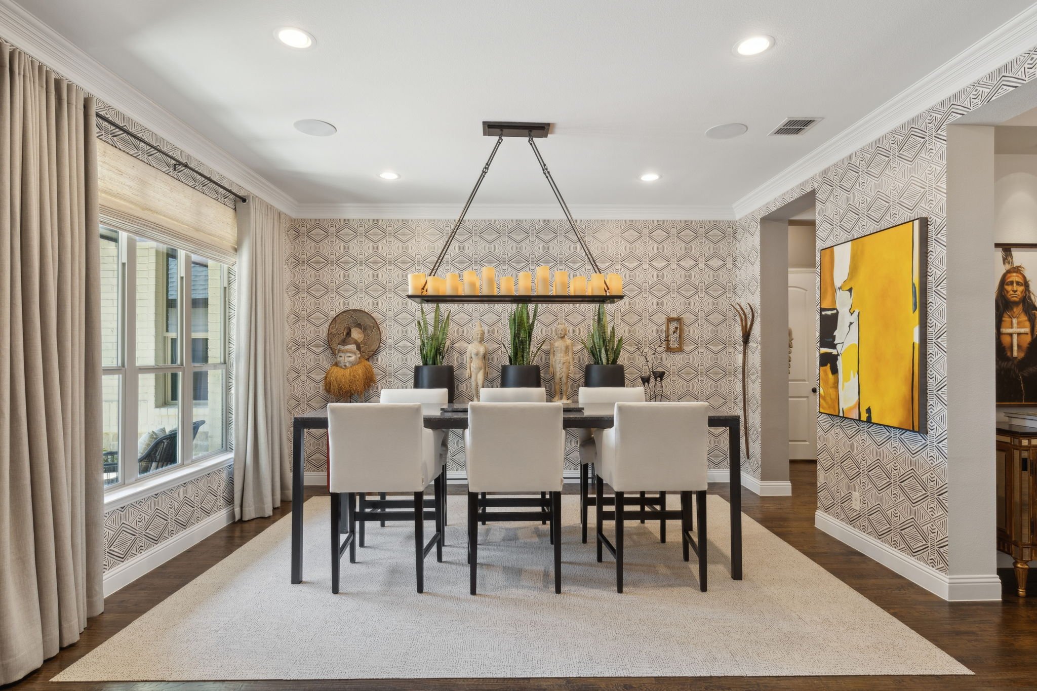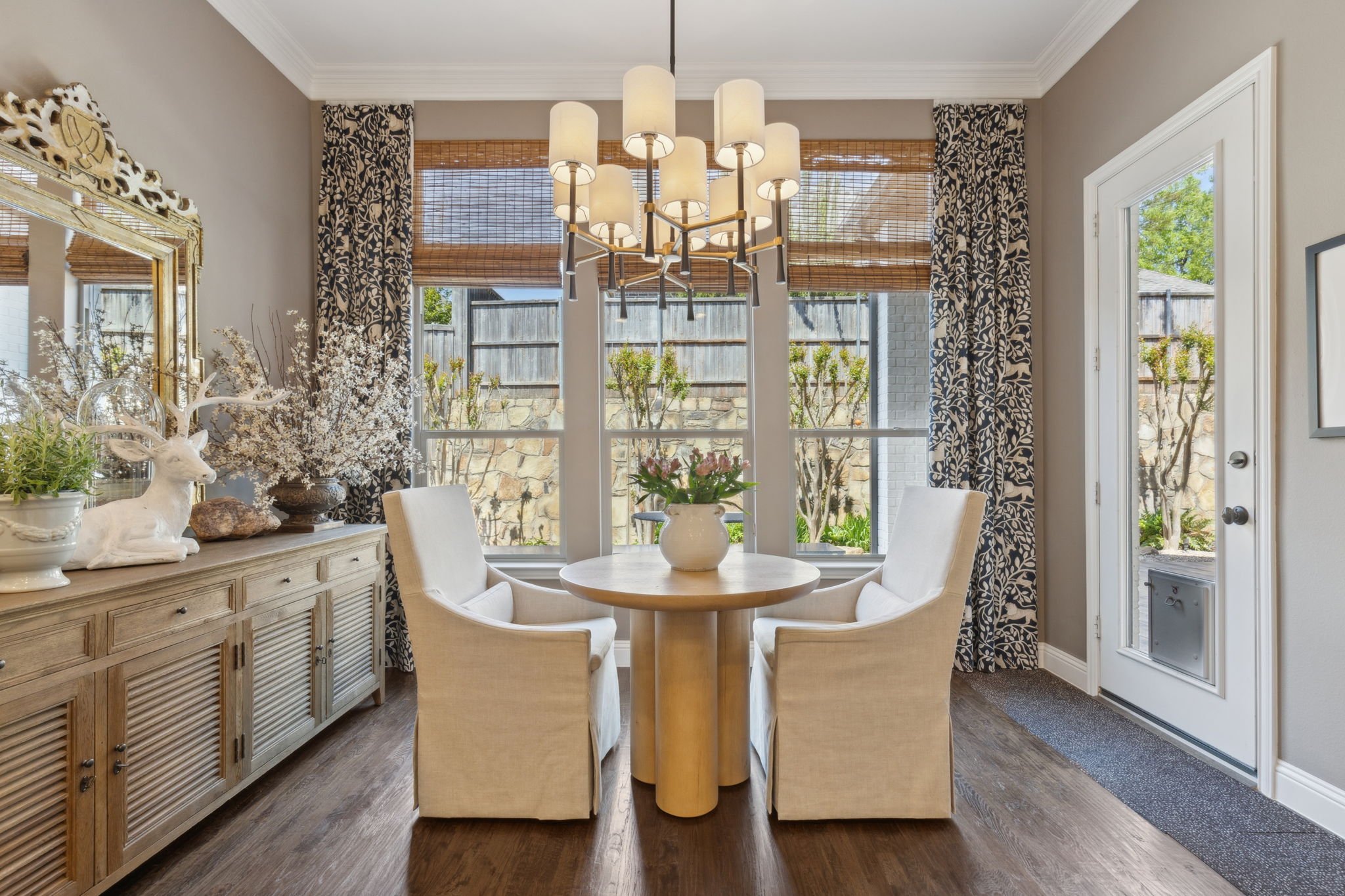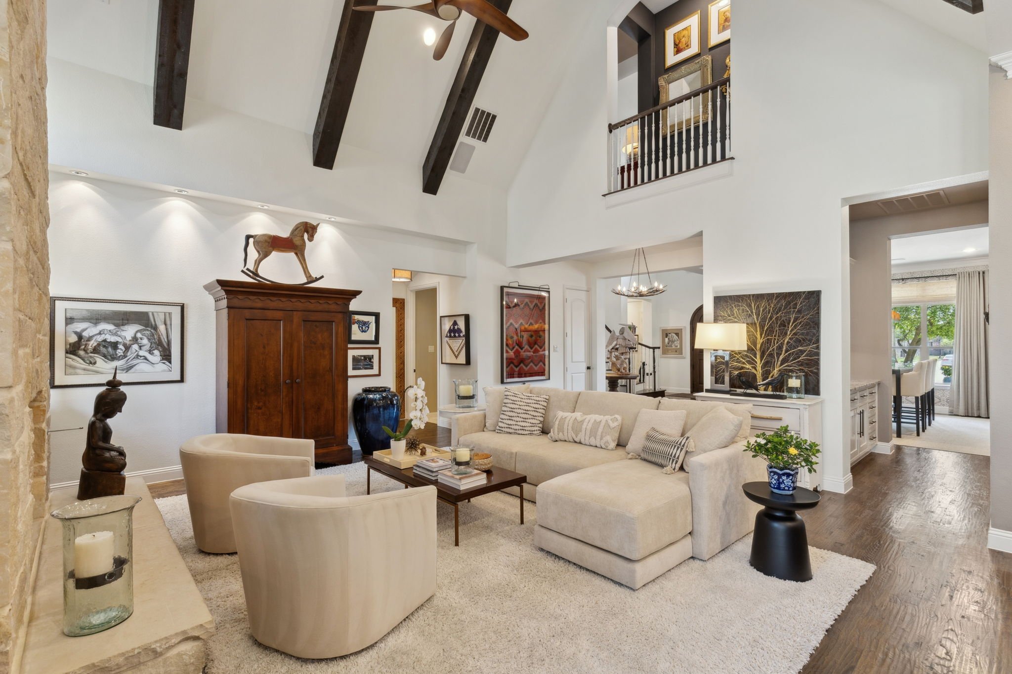 Step inside to discover a light-filled interior where timeless finishes meet modern comfort. The living room is a showstopper—dramatic ceilings, oversized windows, and a striking stone fireplace create the perfect ambiance for both grand entertaining and cozy evenings at home. Just steps away, the gourmet kitchen is a chef’s paradise, complete with stainless steel appliances, granite countertops, custom cabinetry, and a large island that serves as the hub for cooking, gathering, and connection.