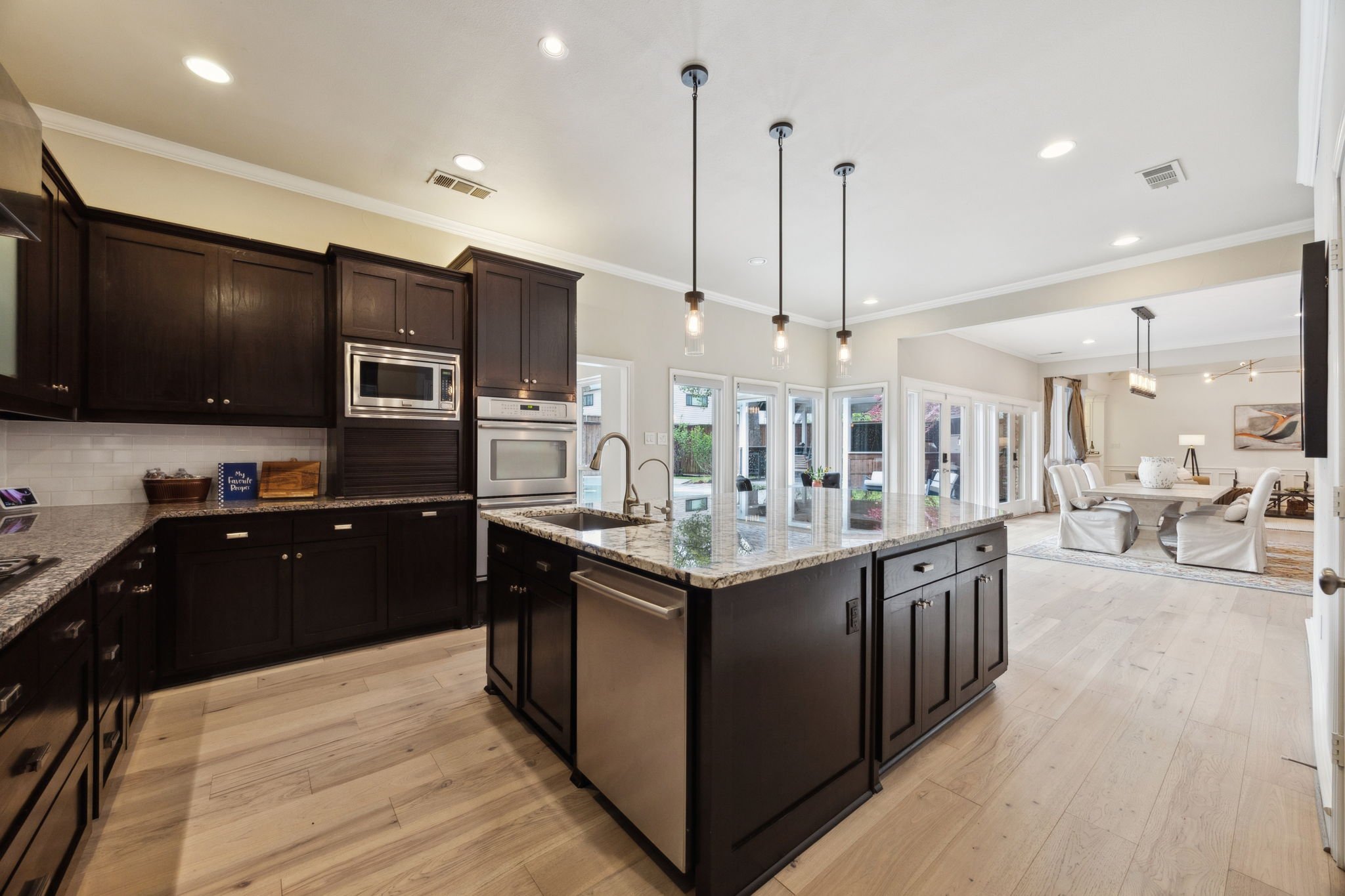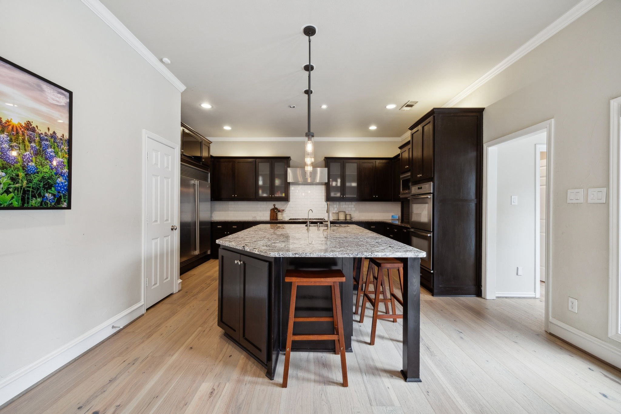 At the heart of the home lies a gourmet chef’s kitchen, a true culinary masterpiece, featuring premium stainless steel appliances, sleek quartz countertops, a spacious center island, and custom cabinetry—ideal for everything from intimate dinners to large-scale entertaining.