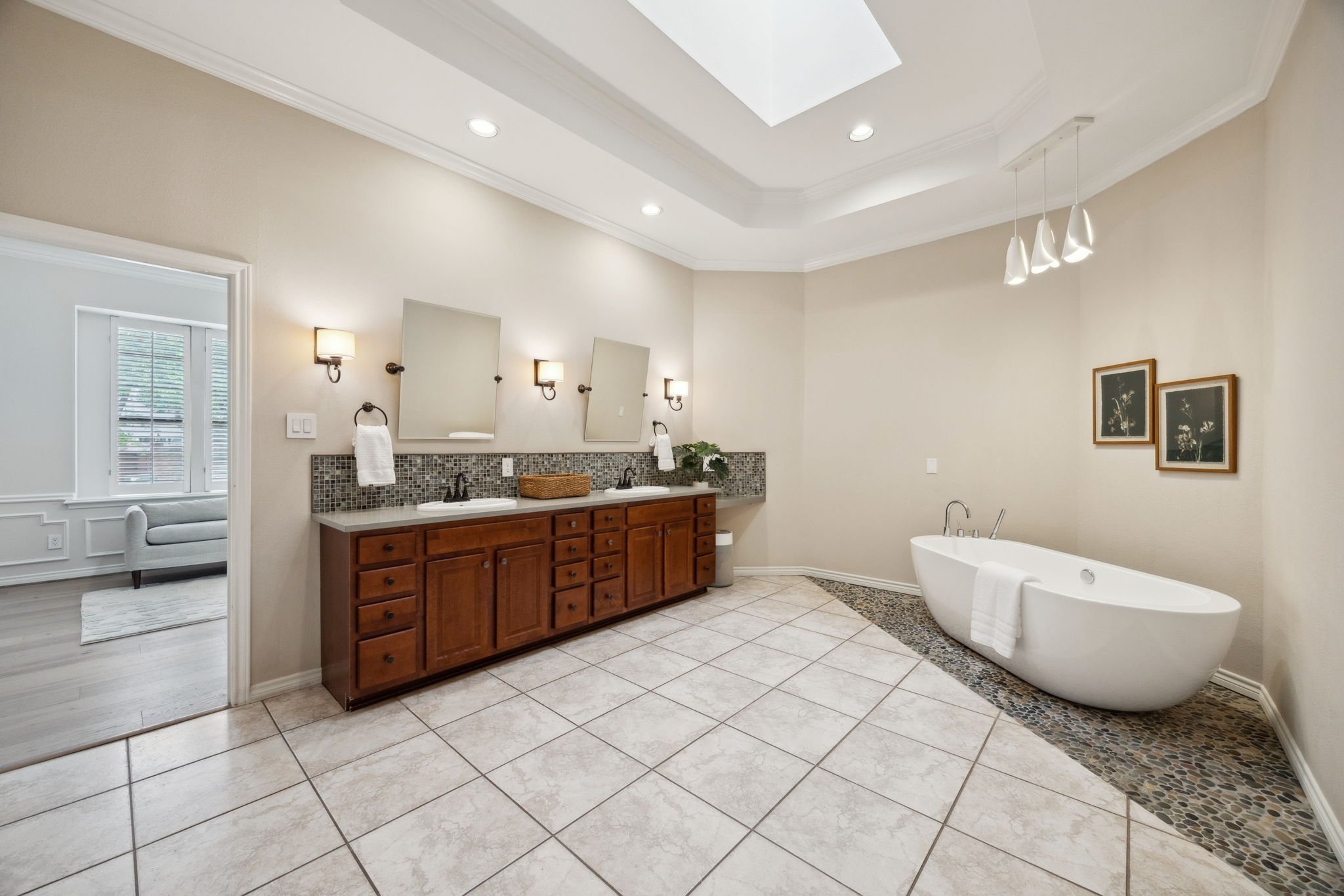Retreat to the luxurious primary suite, a private oasis with a cozy sitting area, a statement fireplace, and spa-like ensuite bathroom, complete with a soaking tub, oversized walk-in shower, and dual vanities. Additional bedrooms are generously sized, each offering a tranquil ambiance and sophisticated design.