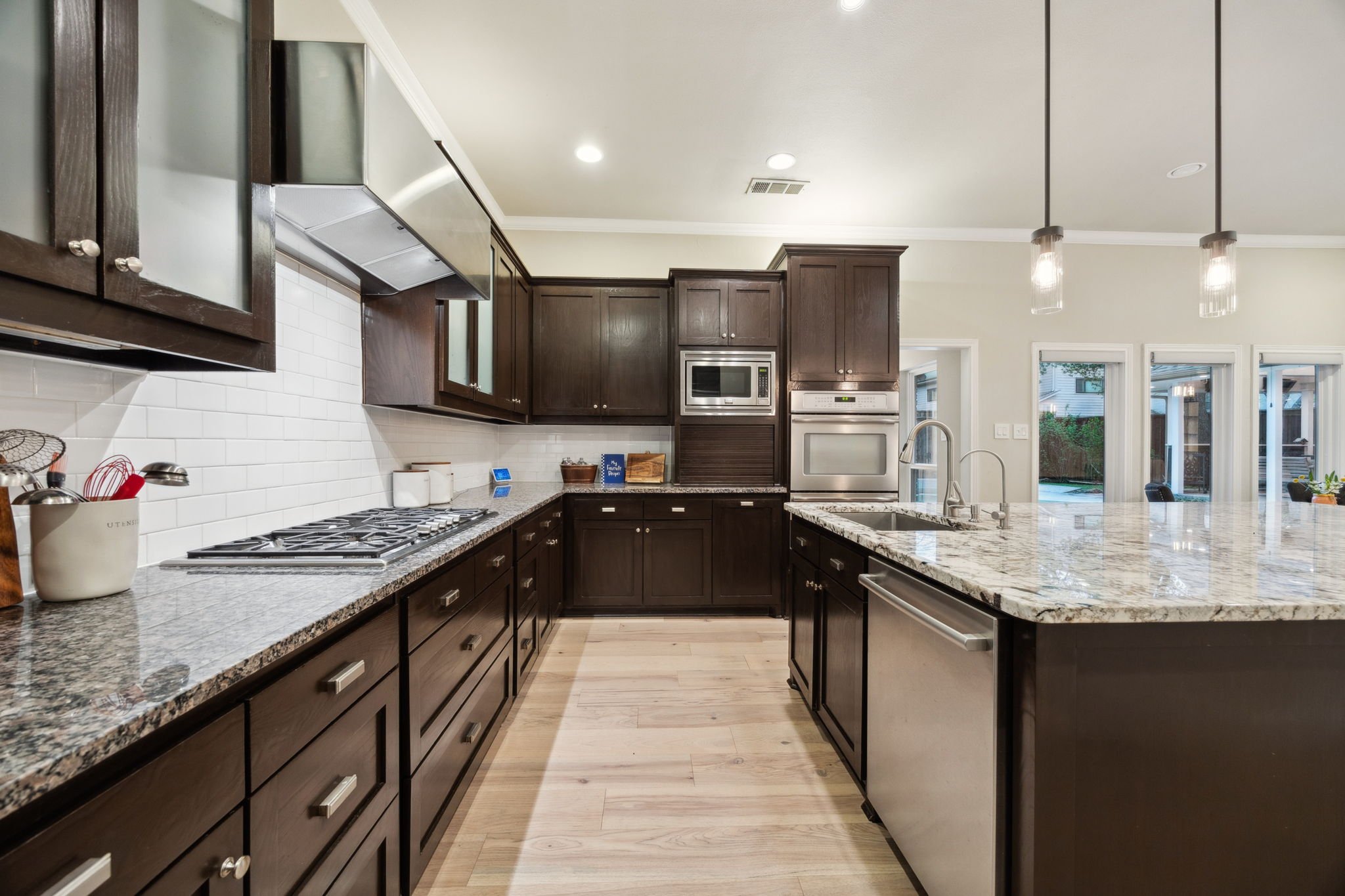 Step outside into your personal outdoor paradise—where a sparkling pool invites you to unwind and relax. The covered outdoor living space is equipped with a mounted TV, surround sound speakers, heaters, and an outdoor kitchen. Whether hosting lively gatherings or enjoying quiet evenings, this outdoor haven is designed for year-round enjoyment.